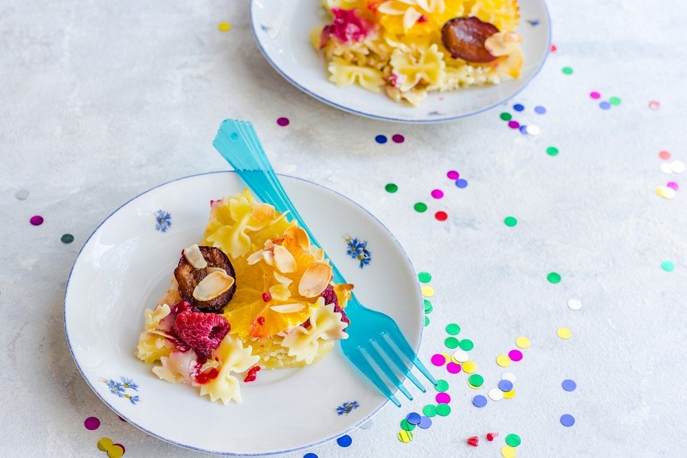 Zapiekanka makaronowa na słodko z twarożkiem i owocami