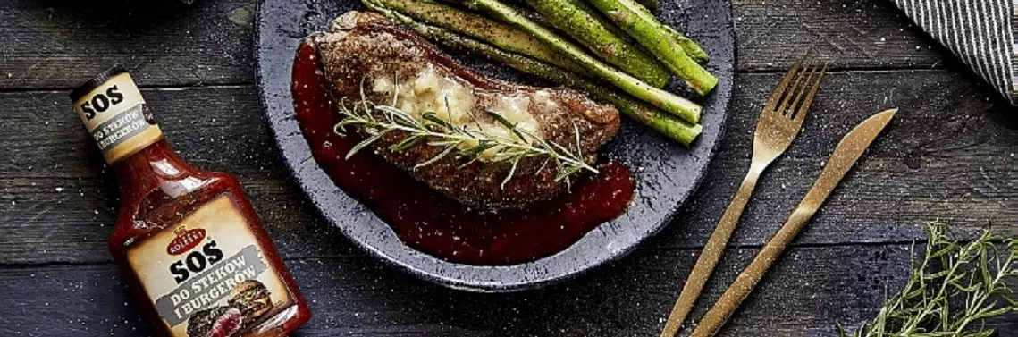 Steki mogą być przygotowane z różnego rodzaju mięsa wołowego oraz przyrządzone w różnym stopniu wysmażenia - wszystko zależy od indywidualnych preferencji kucharza lub jego gości. Steki serwować można z wieloma dodatkami, np. warzywami sezonowymi. Przygotowując steki, warto pamiętać, że to wyjątkowe mięso poddawane obróbce termicznej musi mieć temperaturę pokojową, dlatego warto je wyjąć z lodówki ok. 30 min przed rozpoczęciem przyrządzania. Chcąc podać steka bardzo krwistego, czas smażenia powinien wynosić około minuty z każdej strony. W przypadku steka krwistego - po dwie minuty na stronę, średnio krwistego - po trzy minuty, średnio wysmażonego powinniśmy trzymać na patelni około pięciu lub sześciu minut z obu stron, natomiast stek dobrze wysmażony powinien spędzić na patelni osiem minut. Niezależnie od wybranego stopnia wysmażenia, intensywność jego smaku możemy zwiększyć świeżym smakiem sosu do steków i burgerów firmy Roleski. Jest to oryginalna kompozycja składników, których kwintesencją jest sos pomidorowo-paprykowy z dodatkiem pieprzu cayenne, chrupiącej cebuli oraz kolendry. Sos do steków i burgerów idealnie będzie współgrał z aromatycznym stekiem z masłem czosnkowym, rozmarynem i szparagami:
