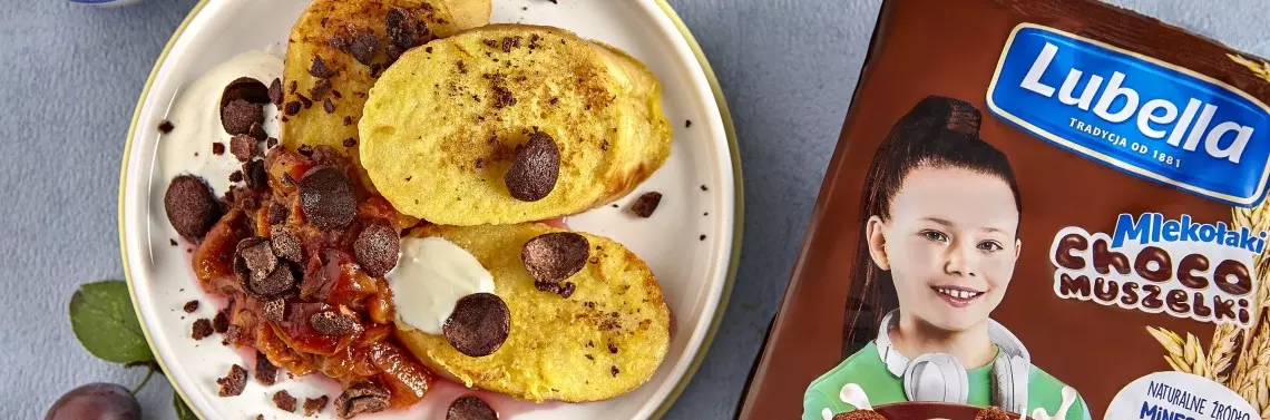 Podawać na ciepło, z gorącymi śliwkami, jogurtem oraz płatkami Choco Muszelki.