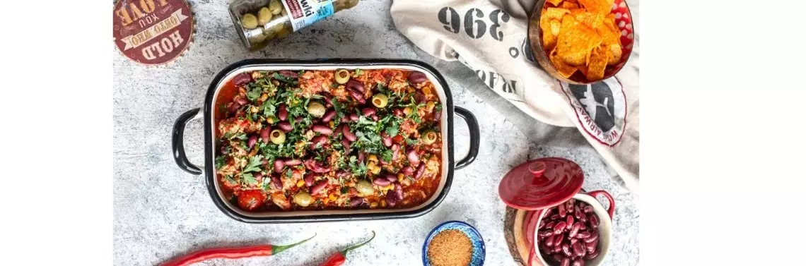 Chilli con carne zapiekane z nachosami i Oliwkami z pastą paprykową OLE!