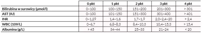 Tabela 2. Zmodyfikowana skala Kings College służąca kwalifikacji pacjentów z chorobą Wilsona do przeszczepu wątroby (= i >11 pkt bardzo wysokie prawdopodobieństwo zgonu bez przeszczepu – wskazanie do transplantacji) [4]