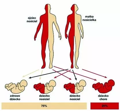 Rys. 3. Dziedziczenie zmutowanego genu powodujące chorobę autosomalną recesywną (w przypadku gdy oboje rodziców są nosicielami uszkodzonego genu)