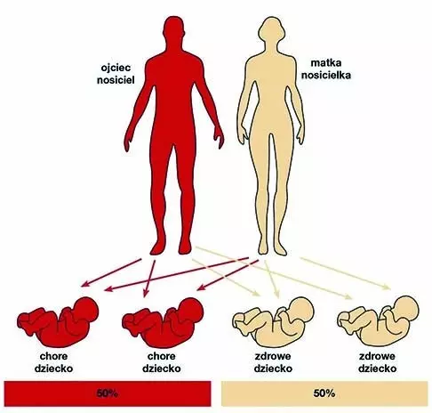 Rys. 4. Dziedziczenie zmutowanego genu powodujące chorobę autosomalną recesywną (w przypadku gdy jeden rodzic jest zdrowy, a drugi chory)