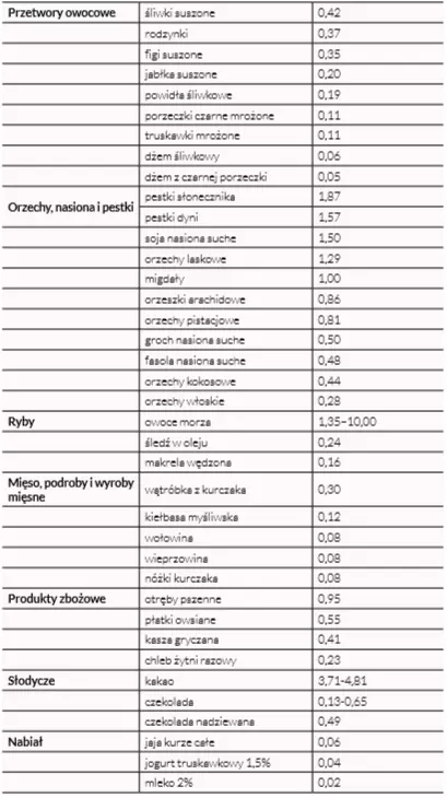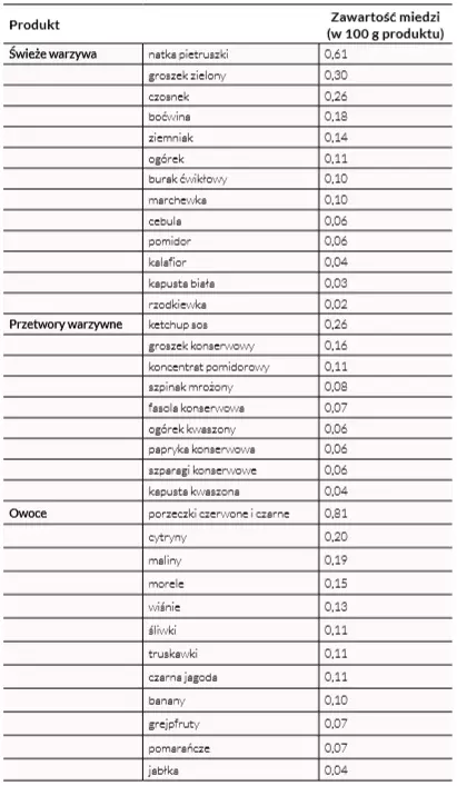 Tabela 3. Zawartość miedzi w poszczególnych produktach [10]