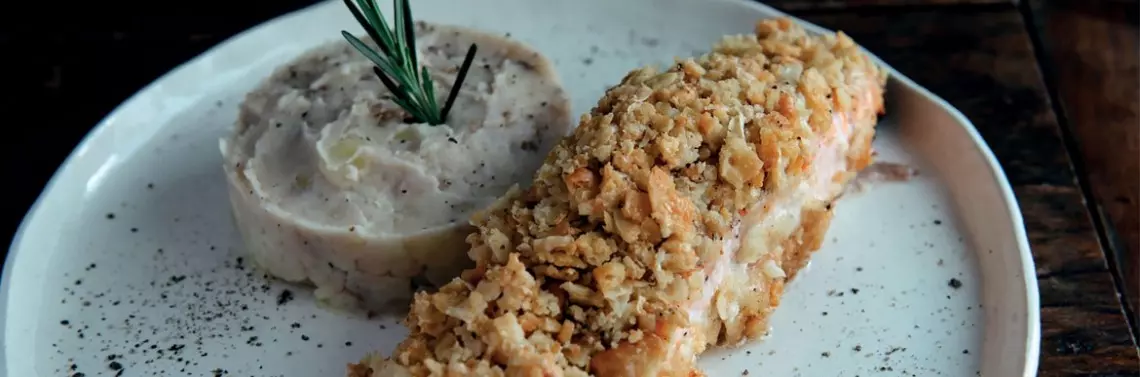 - Posmarować filet z jednej strony miodem. Dodać następnie warstwę farofy.