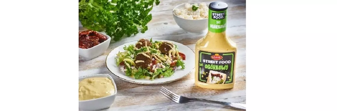 Na talerzu układamy po 3 falafele, posypujemy wędzonym twarogiem i polewamy sosem ogórkowym Roleski z linii Street food.