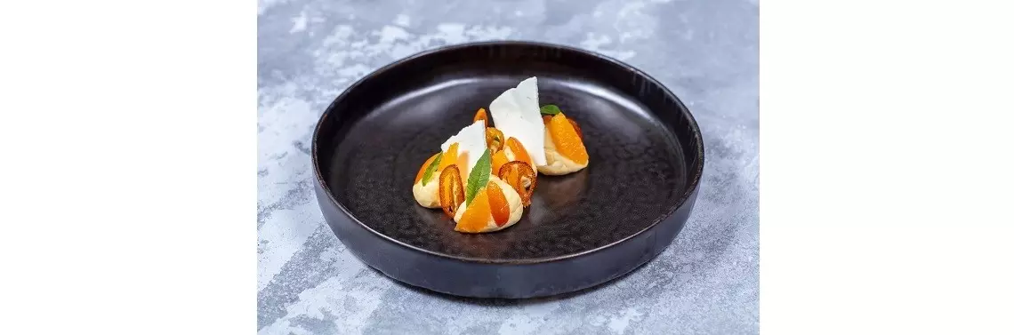 Najpierw umieszczamy krem w kilku miejscach na talerzu. Następnie układamy segmenty z klementynek, konfiturę z kumkwatu i chipsy. Dodajemy bezę klementynkową i liście werbeny.