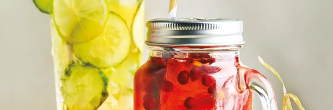kompozycja WELLNESS&SPA, plastry ogórka, limonki i/lub cytryny, syrop z czarnego bzu, kostki lodu.
