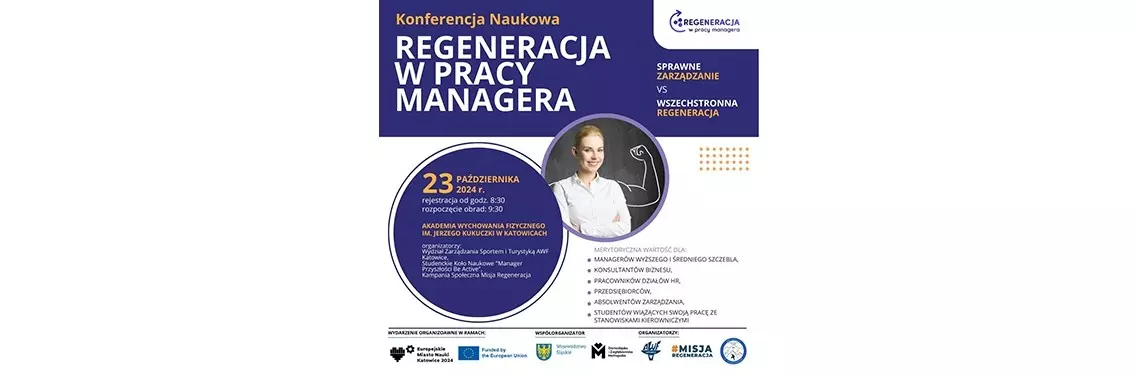 Wydarzenie realizowane jest w paśmie Miasto-Region-Akademia, w ramach obchodów Europejskiego Miasta Nauki Katowice 2024. Organizatorami Konferencji są: Wydział Zarządzania Sportem i Turystyką AWF Katowice, SKN “Manager Przyszłości Be Active” oraz kampania społeczna Misja Regeneracja.