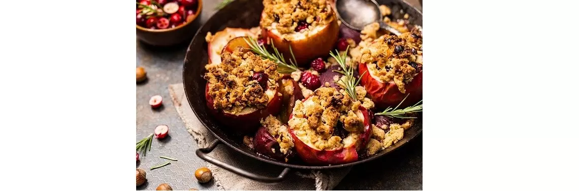 Ułóż jabłka w formie do zapiekania. W środek każdego jabłka włóż miks rodzynek i żurawiny. Obok jabłek ułóż połówki śliwek, świeżą żurawinę oraz ścięte wcześniej góry jabłek. Polej owoce miodem, pokrusz na wierzch kruszonkę.