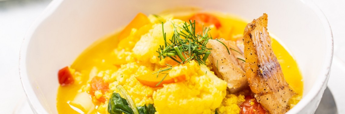 7. Podawaj zupę z cząstkami ryby, całość posyp ziołami.