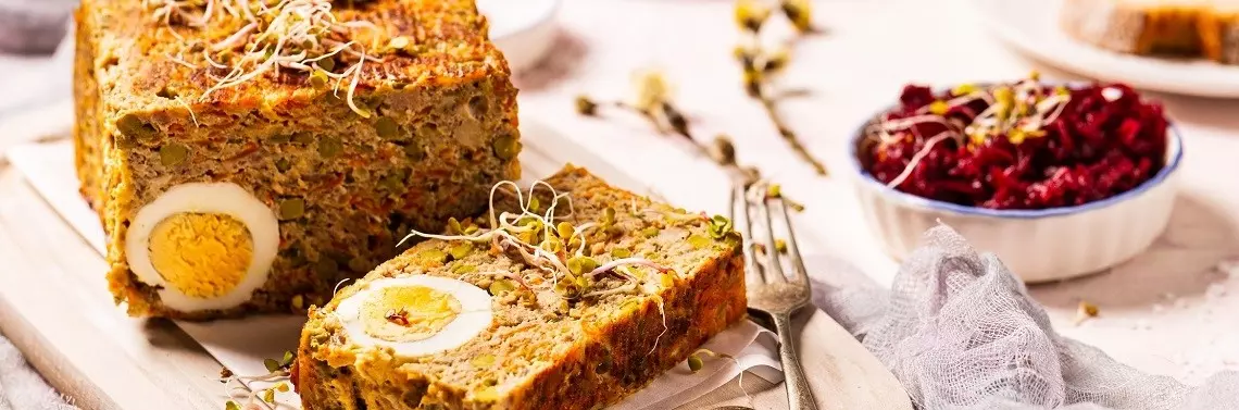 6. Keksówkę wysmaruj olejem, wyłóż papierem do pieczenia. Na dno formy przełóż 1/2 masy, na to wyłóż na całą długość obrane jajka. Całość przykryj resztą masy mięsno-warzywnej. Wyrównaj powierzchnię, posmaruj olejem i piecz w 180°C przez 60 minut.