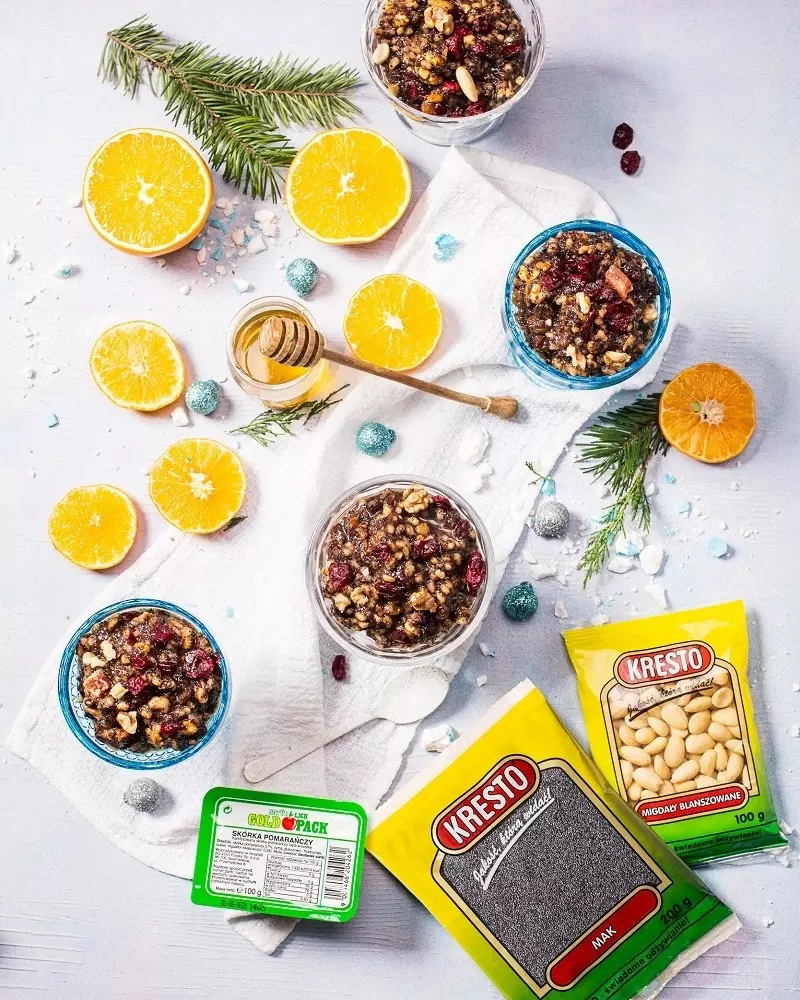 4. Do miski przekładamy zmielony mak, pszenicę, orzechy, migdały, skórkę pomarańczową, wanilię oraz miód. Całość dokładnie mieszamy i odstawiamy na kilka godzin do lodówki.