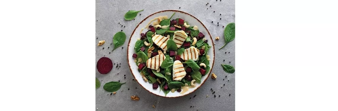 Szpinak młody marki Eisberg ułożyć w miseczce. Upieczone buraki pokroić
