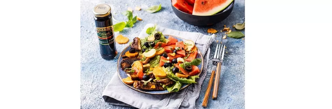Arbuza obierz ze skórki, pokrój go w mniejsze kawałki. Ułóż na talerzach.