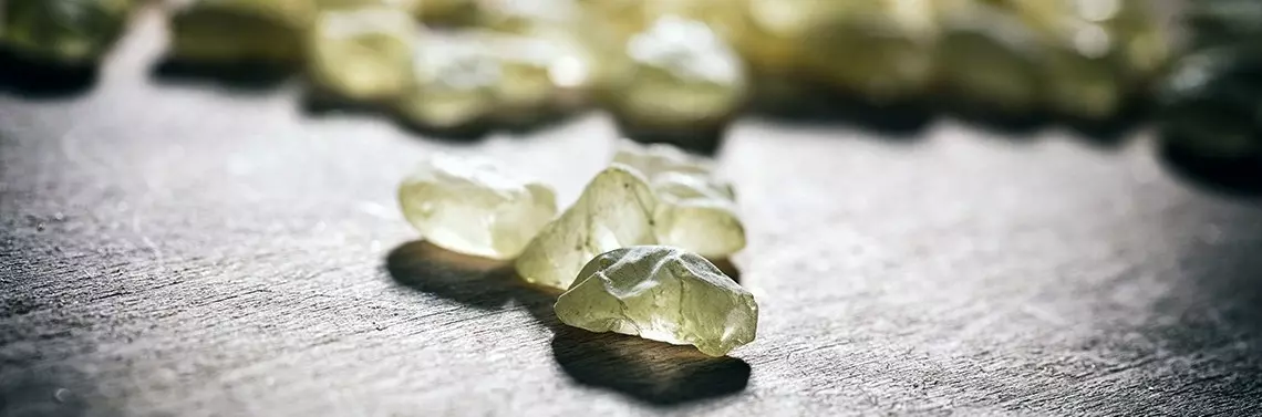 Żywica przyjmuje formy grudek różnej wielkości, koloru – żółtawy, zielonkawy, przezroczysty, mętny i kształtu – gruszkowaty, kulisty, walcowaty lub jajowaty. Zapach balsamiczny.