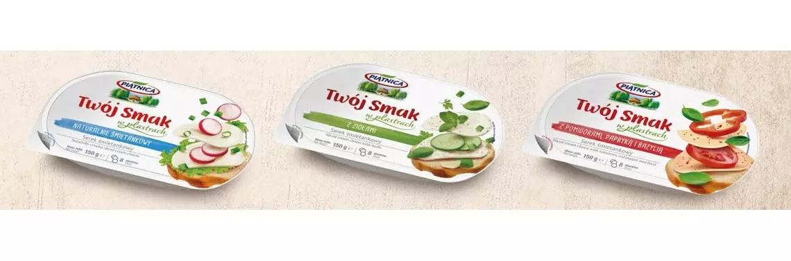 Serki w plastrach znakomicie uzupełniają linię śmietankowych serków Twój Smak z Piątnicy. To produkty charakteryzujące się wyśmienitym, kremowym smakiem i stanowiące przepyszny dodatek do pieczywa. Odświeżona szata graficzna serków w plastrach nawiązuje do prostego, naturalnego składu produktów oraz czystości surowca, z którego są wytwarzane. Nowe opakowania są czytelne i w przejrzysty sposób pokazują, jak łatwo i szybko można przygotować smaczną kanapkę z serkiem śmietankowym w plastrach.