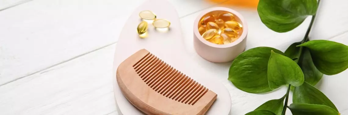 Witaminy z grupy B, jako niezbędne koenzymy gwarantujące prawidłowy przebieg wielu procesów metabolicznych, mają wpływ na stan skóry i błon śluzowych, są niezbędne do wzrostu włosa, umożliwiają m.in. poprzez udział w wytwarzaniu energii przyrost łodygi włosa [16, 18]. Witaminy: B1 (tiamina), B2 (ryboflawina), a także B6 (pirydoksyna) uczestniczą w metabolizmie aminokwasów stanowiących materiał budulcowy włosa. Witamina B5 (kwas pantotenowy) stymuluje keratynocyty do syntezy białka budulcowego – keratyny. Ponadto wspiera pigmentację włosów, pomaga zachować odpowiednią ich wilgotność, zdolność do absorpcji wody oraz sprężystość [19, 20]. Witamina B7 (biotyna) jest niezbędna do aktywności wielu układów enzymatycznych. Zawiera siarkę, co determinuje jej znaczenie w prawidłowym wzroście włosów oraz utrzymaniu dobrej kondycji skóry głowy. Dzięki biotynie w macierzy włosa powstają mostki disiarczkowe, będące rusztowaniem spajającym aminokwasy w obrębie łańcuchów keratyny, co wzmacnia macierz włosa, spaja łodygę włosa na całej długości oraz zwiększa odporność włosów na uszkodzenia. Ponadto biotyna reguluje metabolizm tłuszczów, zapobiegając tym samym występowaniu łojotoku oraz łupieżu, a także korzystnie wpływa na stan korzeni włosów oraz tempo ich wzrostu [11, 16, 19, 20, 21].