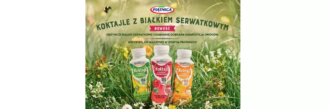 Koktajle z białkiem serwatkowym to nowa kategoria produktów, w których składzie występuje świeże, nieprzetworzone białko serwatkowe, będące najbardziej wartościowym białkiem mleka. Koktajle z białkiem serwatkowym z Piątnicy dostępne są w 3 wariantach smakowych: Malina, granat i żeń-szeń, Mango, marakuja i owies oraz Banan, agrest i błonnik, a każda butelka zawiera aż 28 gramów pełnowartościowego białka. Połączenie świeżego białka serwatkowego i smakowitych owoców czyni z Koktajli unikalną przekąskę – niezwykle smaczną, a równocześnie naturalną, zdrową i odżywczą.