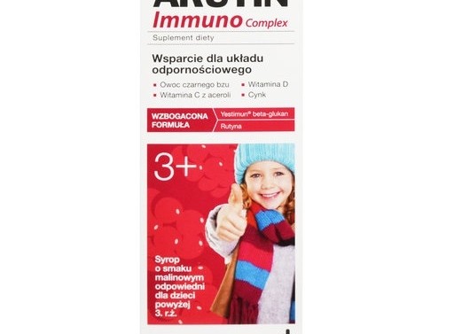 Suplement diety ARUTIN Immuno Complex to unikalna kompozycja 4 składników, które kompleksowo wspierają układ immunologiczny: owoc czarnego bzu, naturalną witaminę C z aceroli, cynk oraz witaminę D. Formuła syropu została wzmocniona opatentowanym składnikiem Yestimun® beta-glukan oraz rutyną. Pyszny malinowy smak, sprawia że jest przyjemny dla dziecka (zawiera naturalne owoce malin). Odpowiedni dla dzieci w wieku przedszkolnym, powyżej 3 roku życia. Suplement diety ARUTIN IMMUNO Complex znajduje zastosowanie: • w okresie jesienno-zimowym, w celu wspomagania odporności organizmu u dzieci • całorocznie, wspomagająco procesy odpornościowe. Opakowanie: 120 ml, Producent: Przedsiębiorstwo Farmaceutyczne LEK-AM Sp. z o.o., Cena dla pacjenta ok. 9,50 PLN (estymacja)