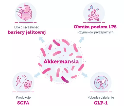 A. muciniphila zwiększa aktywność komórek L jelita, powodując uwalnianie GLP-1, który ma działanie anorektogenne - wzmacnia wydzielanie insuliny i hamuje wydzielanie glukagonu w odpowiedzi na przyjęcie pokarmu oraz zwiększa poczucie sytości [5].