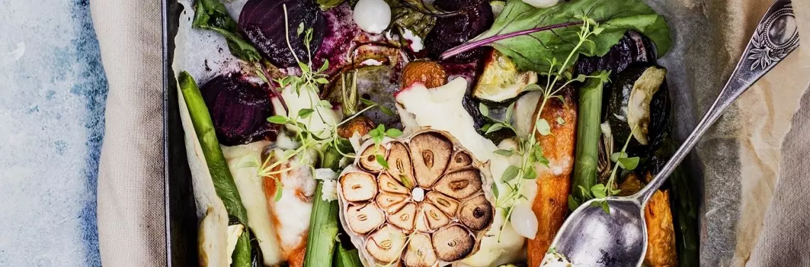 Buraczki, marchewki oraz bataty myjemy i obieramy i kroimy na mniejsze części. Cukinię kroimy na grubsze plastry. Główkę czosnku przekrawamy na pół. Warzywa, wraz z liśćmi botwinki oraz kawałkami sera wkładamy do żaroodpornego naczynia (wcześniej ułożyć na nim papier do pieczenia). Obficie polewamy oliwą i posypujemy solą, pieprzem oraz ulubionymi ziołami. Pieczemy w 180C przez ok. 30 min do miękkości. W tym czasie dokładnie mieszamy sos śmietanowy do warzyw. Na ok.3 minuty przed końcem dodajemy cebulki OLE!. Danie podajemy na ciepło lub zimno z sosem śmietanowym.