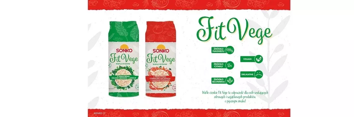 Nowe wafle firmy SONKO to propozycja dla osób szukających zdrowych i lekkich produktów o niebanalnym smaku, przy tym bogatych w wartościowe składniki odżywcze. Delikatne, chrupiące wafle powstały z połączenia warzyw i ziaren ryżu. Dostępne są dwa warianty wafli: z czerwoną soczewicą i suszonym pomidorem z zielonym groszkiem i jarmużem. Pomidor jest źródłem likopenu, a soczewica - białka. Z kolei jarmuż i zielony groszek to naturalne skarbnice witamin, wapnia i magnezu. Głównym składnikiem obu produktów jest ryż brązowy, który zawiera węglowodany złożone i jest bogaty w błonnik pokarmowy. Jako że ryż brązowy nie zawiera glutenu, wafle są świetną alternatywą dla osób będących na diecie bezglutenowej. Nowa propozycja od SONKO z pewnością rozszerzy asortyment produktów również dla zwolenników diety wegańskiej. Wafle ryżowe z warzywami SONKO idealnie sprawdzą się jako przekąska między posiłkami, a także baza do tworzenia kanapek na słono i na słodko. Jeden wafel „Fit Vege” z czerwoną soczewicą i suszonym pomidorem ma jedynie 25 kalorii, a z zielonym groszkiem i jarmużem 26 kalorii, co łatwo pozwala kontrolować ich spożycie.