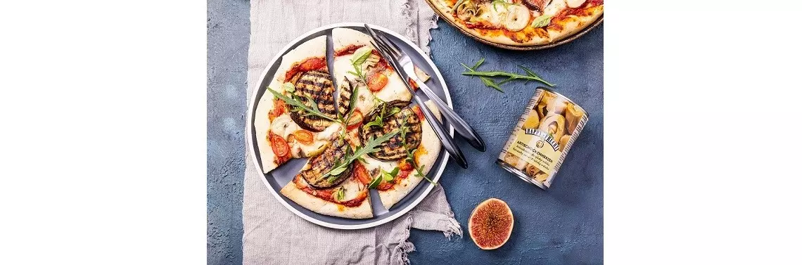 Posmaruj blaty koncentratem pomidorowym, posyp oregano oraz drobno pokrojonym czosnkiem. Ułóż plastry mozarelli, osączone anchois, plastry bakłażana, pokrojone figi oraz pomidorki. Pizzę piecz przez 7–10 minut w rozgrzanym do 250°C piekarniku z funkcją góra-dół.