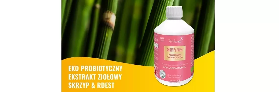 Probiotyczny EKO ekstrakt ziołowy SKRZYP & RDEST powstaje w kaskadowym procesie fermentacji roślin ziołowych z udziałem żywych i aktywnych szczepów bakterii probiotycznych min. 2x107 jtk/ml, w tym: Lactobacillus rhamnosus GG, L. rhamnosus LR 04, L. rhamnosus LR 05, L. acidophilus LA 1, L. delbrueckii ssp. bulgaricus LB 2, L. casei 101/37, L. plantarum LP 02, L. plantarum LP 01, L. fermentum LF2, Bifidobacterium breve BL 10, B. breve Bbr 8, B. longum BL 03, B. animalis ssp. lactis Bi 1, Streptococcus thermophilus Z 57, S. thermophilus 9 Y.