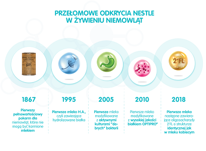 2018 Na bazie badań nad mlekiem mamy Nestlé stworzyło pierwsze mleko następne zawierające 2’FL (2’fukozylolaktozę) – oligosacharyd o strukturze identycznej jak w mleku kobiecym, białko OPTIPRO®, bakterie L.reuteri i DHA*.