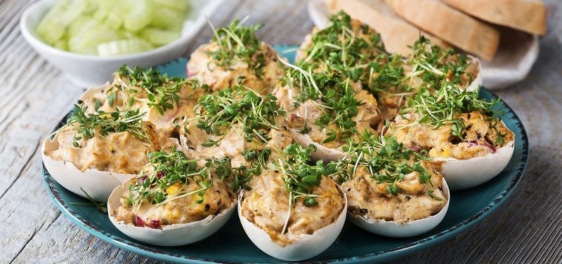 Jajka gotujemy na twardo i studzimy, następnie przecinamy bardzo ostrym, dużym nożem wzdłuż – razem ze skorupką. Wyjmujemy jajka ze skorupki i siekamy. Obieramy awokado, kroimy na dość drobne kawałki i skrapiany sokiem z cytryny. Rzodkiewki kroimy na półplasterki. Łączymy ze sobą wszystkie składniki, dodajemy rzeżuchę lub kiełki, część odkładając do przybrania. Mieszamy wszystko dokładnie z Pastą z pestkami słonecznika z suszonymi pomidorami i bazylią Well Well, doprawiamy ew. pieprzem i solą. Gotową masę nakładamy do pustych skorupek i dekorujemy kiełkami.