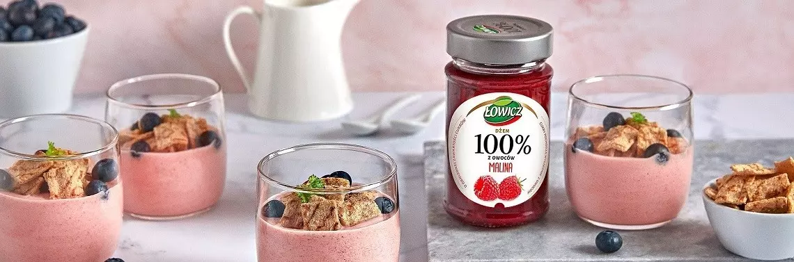 Przepis nr 1: Pełnoziarniste śniadanie z wykorzystaniem zbożowych płatków Lubella Cinisy, Dżemu Łowicz 100% z owoców Malina i jogurtu naturalnego*