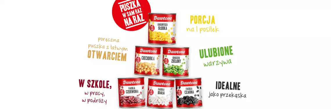 Co ważne, propozycja Dawtony to także odpowiedź na problem coraz częstszego wyrzucania przez Polaków niespożytej żywności. Mniejsza puszka to większa pewność, że jej zawartość zostanie zużyta do końca. Wśród produktów Dawtony, zaserwowanych w wersji mini, znajdziemy: kukurydzę słodką, groszek zielony, cieciorkę, a także fasole: białą, czerwoną oraz czarną.
