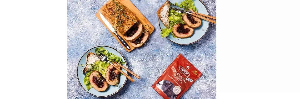 9. Na środek wykładamy przestudzoną konfiturę, łyżką ją rozprowadzamy, zachowując 4–5 cm rant mięsa bez niej.