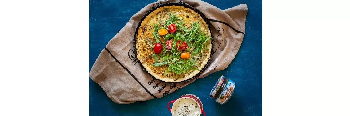 Taki spód nakłuwamy widelcem w wielu miejscach i przekładamy do lodówki na min 1/2 h. W tym czasie kroimy cebulę w półplasterki i podsmażamy. Śmietanę łączymy z jajkami, Pasteną, posiekanym czosnkiem i startym serem.
