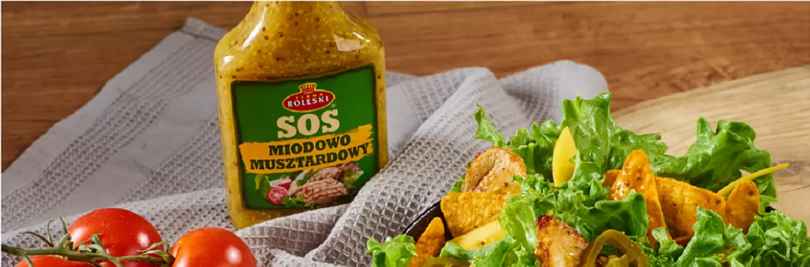 Wytrawne sałatki to idealny pomysł na lekki obiad lub kolację. Ich ogromnym atutem jest uniwersalny skład, który można dowolnie zmieniać w zależności od naszych upodobań. Do stworzenia pysznej sałatki możemy wykorzystywać zarówno warzywa, jak i owoce, a także różnego rodzaju mięsa. Jednak tego typu danie nie może obejść się bez odpowiedniego sosu. Jednym z nich jest Sos miodowo-musztardowy Roleski, który posiada charakterystyczny i wyjątkowo wyrazisty smak. Zawarty w sosie miód nadaje słodyczy, musztarda goryczki, a dodatek łączącego te dwa składniki soku z cytryny scala go w produkt idealny. Sos świetnie współgra smakowo z kurczakiem, dlatego stanowi doskonałe uzupełnienie sałatki honey mustard. Jej sekret tkwi w zrównoważonym połączeniu delikatnego drobiu z warzywami, owocami oraz Sosem miodowo-musztardowym Roleski - a to wszystko z dodatkiem chrupiących nachosów.