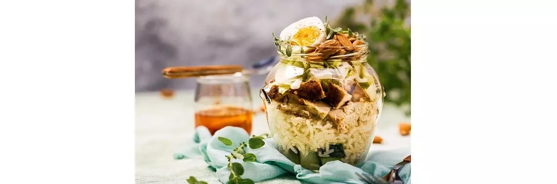 Sałatkę układamy warstwowo w słoiku, pojemniku lub mieszamy składniki ze sobą.