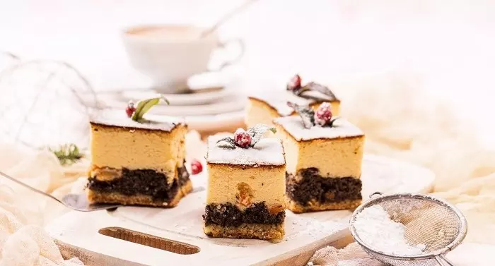 3. Masa serowa: Żółtka, cukier oraz cukier waniliowy przekładamy do misy miksera i ubijamy do momentu uzyskania gęstego i jasnego kremu. Następnie porcjami dodajemy ser, cały czas ubijając przy tym masę. Do masy serowej wlewamy mleko i olej i ponownie miksujemy. W kolejnym kroku dodajemy budyń, mleko w proszku, olejek waniliowy. Całość dokładnie mieszamy. Na koniec łączymy to z ubitymi w osobnym naczyniu białkami jajek i delikatnie mieszamy. Masę serową wylewamy bezpośrednio na warstwę makową.