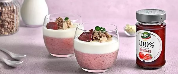 DŻEMOWO-JOGURTOWY PRZEKŁADANIEC Z GRANOLĄ I DŻEMEM ŁOWICZ 100% Z OWOCÓW - TRUSKAWKA