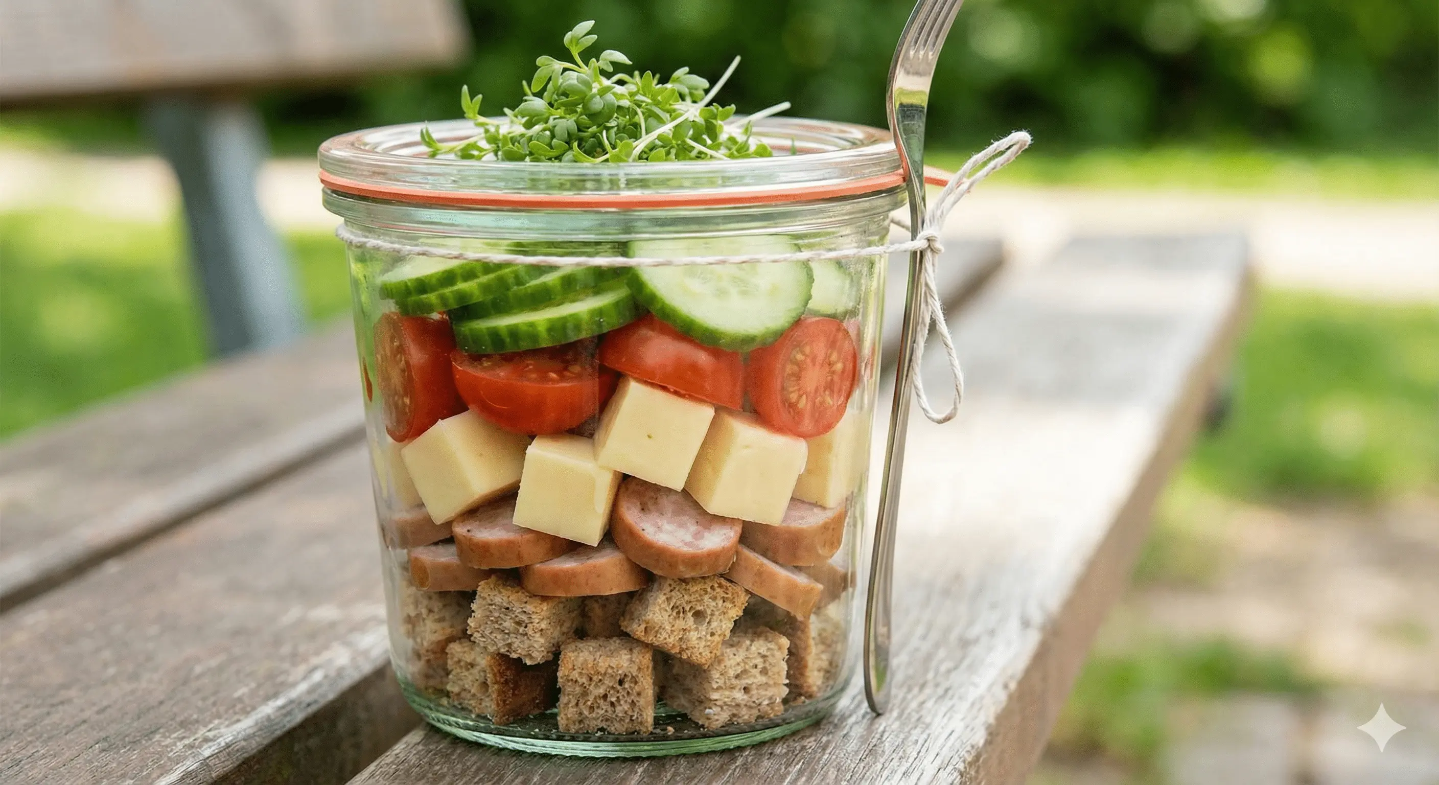 Sałatki doskonale sprawdzają się na drugie śniadanie oraz podczas dłuższych pobytów poza domem. Do ich przygotowania możesz wykorzystać większość produktów spożywczych, które masz na swoich półkach, a następnie podzielić na porcje i przełożyć do słoiczków lub pojemników. Jedną z ciekawszych propozycji jest sałatka z pokrojonym ogórkiem, pomidorami koktajlowymi, kiełbasą i serem raclette. Wyśmienity smak uzyskasz dzięki sosowi z musztardy, octu i oliwy. Całość posyp rzeżuchą i grzankami z chleba razowego. Będzie smacznie, kolorowo i sycąco.