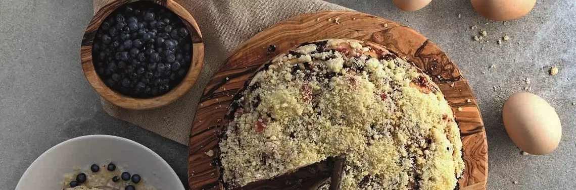 Rozpoczynamy od przygotowania rozczynu. Mleko podgrzewamy (powinno być ciepłe, ale nie gorące), dodajemy łyżeczkę cukru i łyżeczkę mąki, wkruszamy drożdże. Dokładnie mieszamy i odstawiamy w ciepłe miejsce na 10-15 min. do wyrośnięcia. Rozpuszczamy masło. Jajka ucieramy z cukrem, dodajemy porcjami przesianą mąkę. Następnie dodajemy wyrośnięty rozczyn, przestudzone, płynne masło i kilka kropli aromatu waniliowego. Ciasto wyrabiamy mikserem (z końcówką w kształcie haka) lub ręcznie za pomocą drewnianej łyżki. Jest gotowe kiedy uzyska jednolitą, gładką, lśniącą konsystencję i zacznie odklejać się od ścianek miski. Przykrywamy je bawełnianą ściereczką i odstawiamy na ok. 1 godzinę w ciepłe miejsce. Powinno podwoić swoją objętość, dlatego należy użyć większego naczynia. Tortownicę o śr. 24 cm smarujemy masłem, piekarnik rozgrzewamy do 180 st. C. Kiedy ciasto wyrośnie, przekładamy je do przygotowanej tortownicy i na wierzch wykładamy umyte jagody. Masło do kruszonki kroimy na kawałki, łączymy z mąką i cukrem, rozcieramy dłońmi. Gdy uzyskamy drobne grudki, posypujemy nimi równomiernie ciasto. Tortownicę wstawiamy na środkową półkę do piekarnika ustawionego na tryb góra – dół. Pieczemy ok. 1 godz. w temp. 180 st. C. Pod koniec pieczenia sprawdzamy, czy patyczek włożony do ciasta jest suchy.