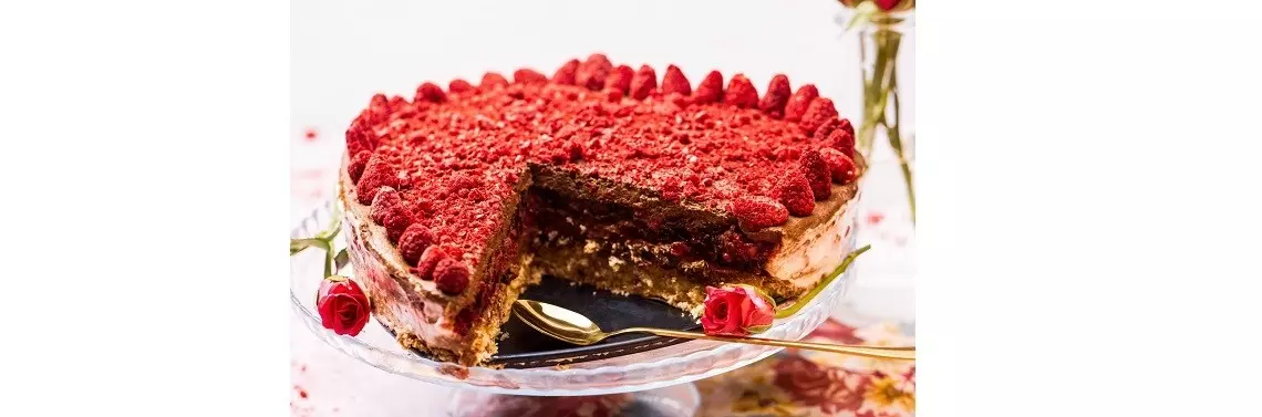 10. Zdejmij obręcz, boki posmaruj jogurtem, a górę ozdób i posyp liofilizowanymi malinami KRESTO.
