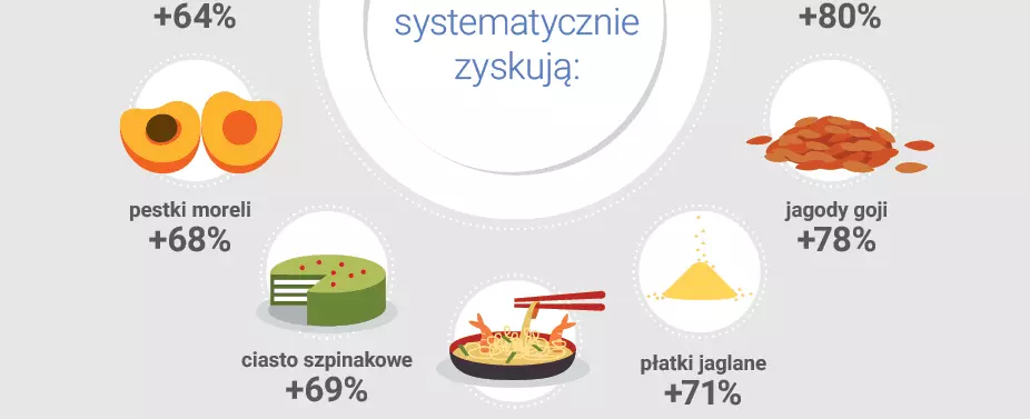 Niektóre produkty i potrawy zyskują popularność systematycznie na przestrzeni kilku ostatnich lat. Porównując dane rok do roku (2014 r. vs 2015 r.) okazuje się, że największe wzrosty notują m.in. olej konopny (+93%), olej z czarnuszki (+87%), sól himalajska (+80%), jagody goji (+78%), płatki jaglane (+71%), pad thai (+70%), ciasto szpinakowe (+69%), pestki moreli (+68%), olej kokosowy (+64%) oraz ramen (+60%).