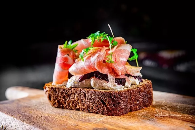 Bruschetta z twarożkiem, suszoną żurawiną i boczkiem