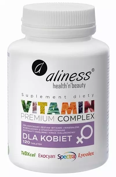 Premium Vitamin Complex dla kobiet firmy Aliness to zbilansowany zestaw witamin i minerałów przeznaczony dla kobiet w każdym wieku. Dzięki zastosowaniu dobrze przyswajalnych form składników, produkt pomaga w uzupełnieniu dziennego zapotrzebowania organizmu kobiety na aż 23 niezbędne mikroskładniki odżywcze. Ze względu na obecność dodatkowych składników dedykowanych zdrowiu kobiet, Premium Vitamin Complex DLA KOBIET wspomaga również funkcjonowanie układu odpornościowego i kostnego, przyczynia się do utrzymania zdrowych włosów, skóry i paznokci oraz pomaga w redukcji tkanki tłuszczowej i w zachowaniu prawidłowej masy ciała.