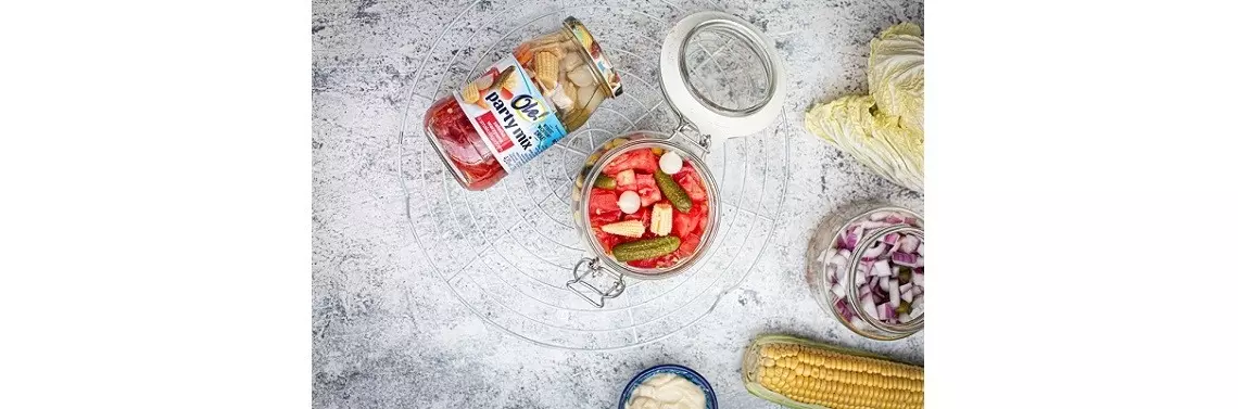 Party Mix OLE! to zrównoważona kompozycja smaków: srebrnej cebulki, mini kukurydzy, marchewki, ogórków konserwowych, kalafiora oraz papryki. Każde z nich osobno jest warte spróbowania, jednak, w połączeniu skomponowanym przez OLE!, gwarantuje wyjątkową fuzję smaków