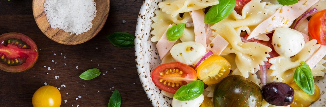 Makaron gotujemy al dente. Odcedzamy, przelewamy zimną wodą. Cebulkę siekamy w piórka. Pomidory kroimy na pół. Mozzarellę odcedzamy z zalewy. Plastry wegetariańskie VeggieDay kroimy w mniejsze kawałki.