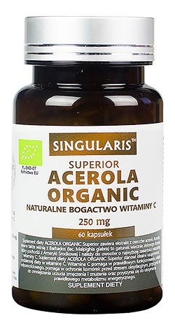 Suplement diety ACEROLA ORGANIC SUPERIOR zawiera naturalny, organiczny standaryzowany ekstrakt z owoców aceroli BIO*. Roślina zwana wiśnią z Barbados (łac.Malpighia glabra) to gatunek wiecznie zielonego krzewu, który pochodzi z Ameryki Środkowej i należy do owoców o najwyższej zawartości naturalnej witaminy C. Średnio w każdych 100 gramach świeżych owoców aceroli znajduje się od 1,5 do 2,5 grama naturalnej i dobrze przyswajalnej witaminy C. Acerola to ważny antyoksydant dla systemu immunologicznego. Dodatkowo w owocach aceroli znajdziemy bogactwo składników budulcowych, prowitaminy A oraz tiamina (witamina B1), ryboflawina (witamina B2), niacyna (Witamina PP), wapń, fosfor i żelazo. Suplement przeznaczony jest dla osób dorosłych i młodzieży po 12 roku życia.