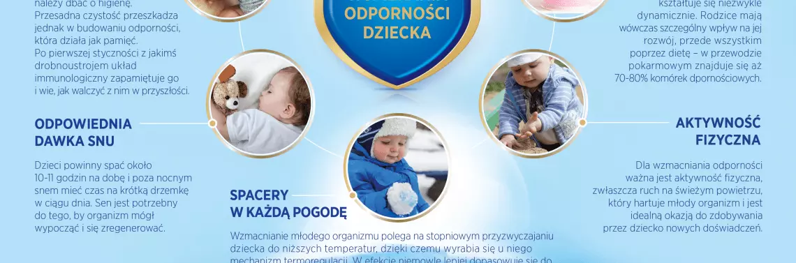 Układ odpornościowy intensywnie kształtuje się przez cały okres ciąży oraz w pierwszych latach życia dziecka. Po narodzinach odporność nie jest jeszcze w pełni dojrzała, jej rozwój to dynamiczny i długotrwały proces, który potrzebuje wsparcia – m.in. poprzez dietę. W czasie ciąży brzuch mamy jest dla dziecka bezpiecznym środowiskiem, jednak w chwili narodzin młody organizm wkracza w przestrzeń pełną zagrożeń, takich jak np. bakterie czy wirusy. Początkowo dziecko jest chronione przed infekcjami głównie dzięki przeciwciałom, które otrzymało przez łożysko mamy. Przeciwciała te zanikają jednak do 6. miesiąca życia niemowlęcia, jednocześnie jego organizm wytwarza swoje własne przeciwciała ale nie wytwarza ich jeszcze w odpowiedniej ilości. To dlatego podstawowym ich źródłem dla dziecka jest mleko matki. Zgodnie z zaleceniami Światowej Organizacji Zdrowia (WHO) przez pierwsze pół roku życia najlepszym sposobem żywienia dziecka, które zapewni mu pożądaną ochronę, jest karmienie piersią.