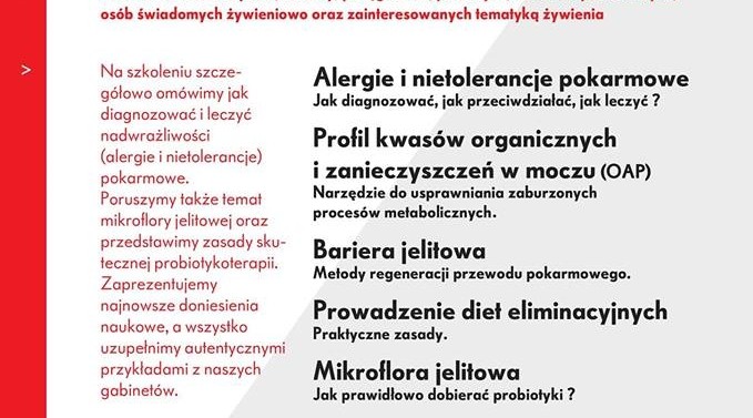 Na szkoleniu szczegółowo omówimy jak diagnozować i leczyć nadwrażliwości pokarmowe (alergie i nietolerancje pokarmowe). Szczegółowo poruszymy temat mikroflory jelitowej i przedstawimy zasady skutecznej probiotykoterapii.